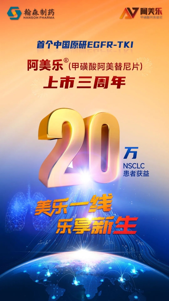 阿美乐®是首个中国原研三代EGFR-TKI类创新药,2020年3月,阿美乐®获批上市,用于既往经EGFR-TKI治疗进展,且T790M突变阳性的局部晚期或转移性NSCLC患者;2021年12月,阿美乐®获批用于具有EGFR外显子19缺失或外显子21(L858R)置换突变阳性的局部晚期或转移性NSCLC成人患者的一线治疗。阿美乐®的上市给中国肺癌患者治疗带来新希望,疗效和安全性得到临床专家的高度认可,一线适应症、二线适应症均获《2022年CSCO非小细胞肺癌诊疗指南》I级推荐。2022年5月,阿美替尼一线注册AENEAS研究报告在国际著名肿瘤学期刊《Journal of Clinical Oncology》(JCO,IF=44.5)重磅发布,标志着国际学术界对阿美替尼的高度认可;6月,一线脑转移数据于ASCO年会发表,CNS mPFS达29个月,为目前所有三代EGFR-TKI中最长CNS PFS数据,充分证明了阿美替尼对于伴脑转移患者的优异疗效。2023年1月,阿美乐®一线治疗适应症纳入国家医保目录,用药可及性进一步提升。上市三年来,阿美乐®累计患及超20万NSCLC患者,带来了更高质量、更长生存的新突破。2022年,阿美替尼在英国和欧洲的上市申请先后获得受理,有望尽快登上国际舞台,开启惠及海外患者的第一步。