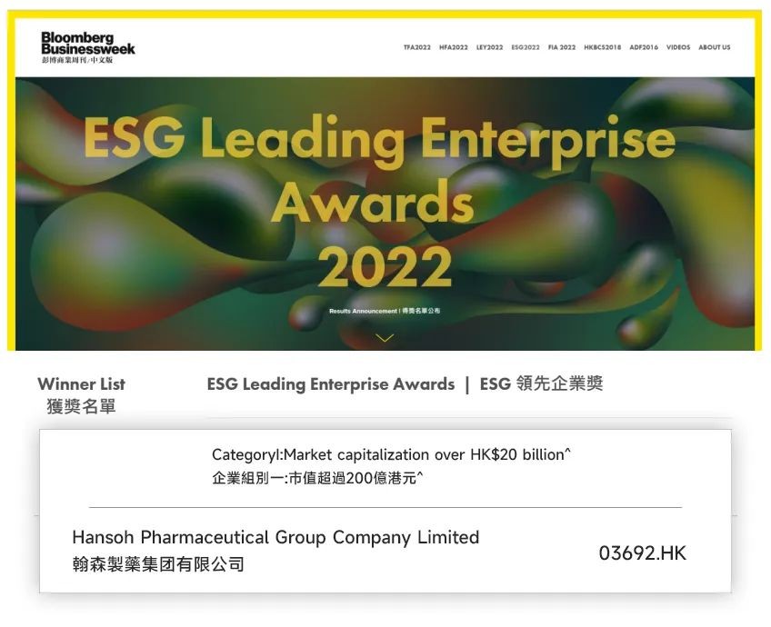 近日,在《彭博商业周刊/中文版》与德勤携手举办的第四届“ESG领先企业大奖”(ESG Leading Enterprise Awards 2022)颁奖典礼上,黄金城集团制药凭借在“企业管治、研发创新、药物可及、绿色环保”等领域的卓越表现,荣膺“ESG领先企业奖”。