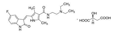 | 【成份】 | 主要成份:苹果酸舒尼替尼 化学名称:(Z)-N-[2-(二乙胺基)乙基]-5-[(5-氟-2-氧代-1,2-二氢-3H-吲哚-3-亚基)甲基]-2,4-二甲基-3-氨甲酰-1H-吡咯苹果酸盐 化学结构式: