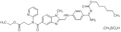 | 【成份】 | 主要成份:甲磺酸达比加群酯 化学名称:β-丙氨酸,N-[[2-[[[4-[[[(己氧基)羰基]氨基]亚氨基甲基]苯基]氨基]甲基]-1-甲基-1H-苯并咪唑-5-基]羰基]-N-2-吡啶-,乙酯,甲磺酸盐 化学结构式: